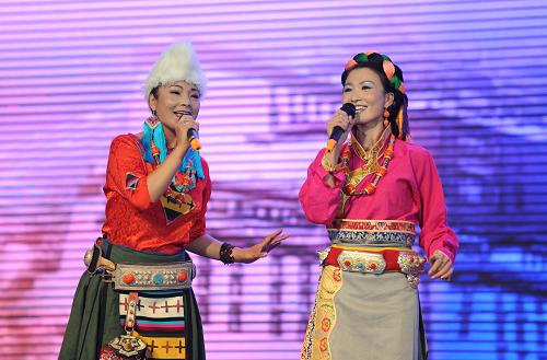 བོད་ཀྱི་གླུ་མ་བཅིངས་གྲོལ་སྒྲོལ་མ་དང་བཀྲ་ཤིས་ལྷ་འཛོམས་གཉིས་ཀྱིས་གླེང་སྟེགས་སྟེང་སྙན་གླུ་འབུལ་བཞིན་པ།